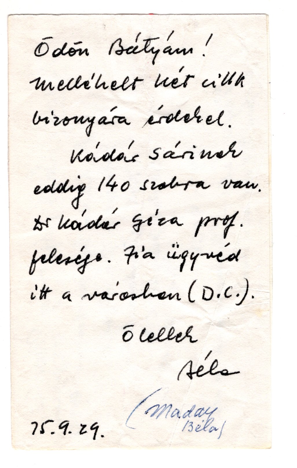 Kádár Sári cédula hátulján lévő kis üzenet, amit Maday Béla írt Vasvárynak.